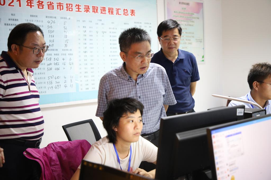 招录现场,李志刚、胡振宇同工作人员亲切交谈,对大家暑假期间坚守岗位、辛勤工作表示慰问,并详细了解了2021年招录工作进展等情况。李志刚表示,希望全体工作人员继续发扬不怕吃苦的工作作风,严格遵守国家高招录取政策和工作纪律,精心组织、规范操作,圆满完成今年高招录取工作任务。招生就业处负责人就我校今年的招生工作进度以及做好下一步招生录取工作等进行了汇报。