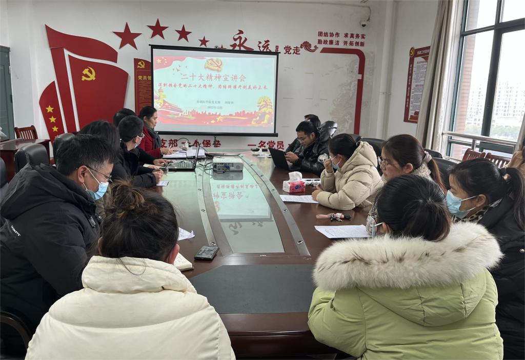 12月13日,按照学校党委统一部署,学院在5号实训楼党员活动室召开会议,学习宣讲党的二十大精神,学院副院长周洁出席,学院党务牵头人刘根林作宣讲报告,小蓝校区全体教职工参加报告会。